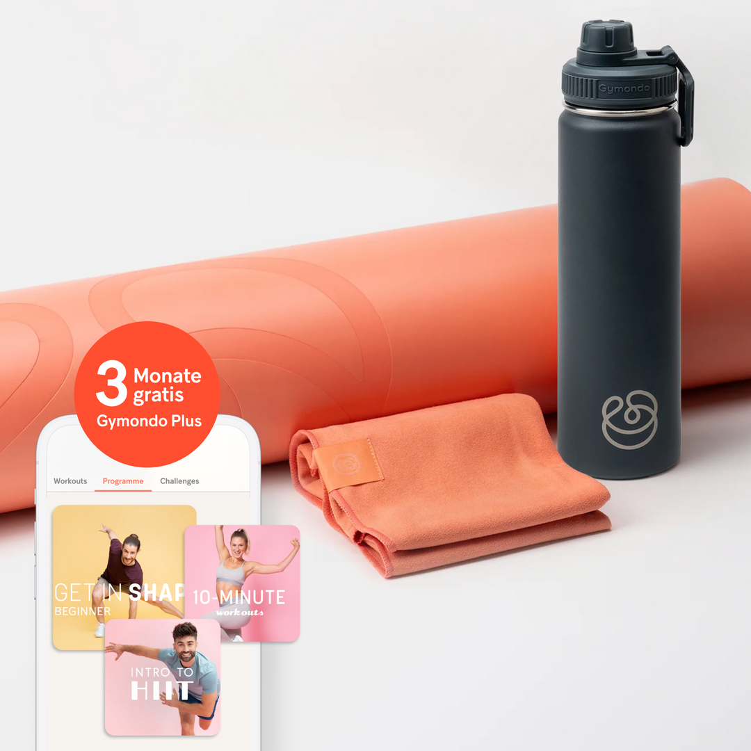 Gymondo-Matte, Trinkflasche & Handtuch günstiger im Set und 3 Monate Gymondo Plus Abo (im Wert von 39,98€) gratis dazu – die ideale Ausstattung für dein Training.